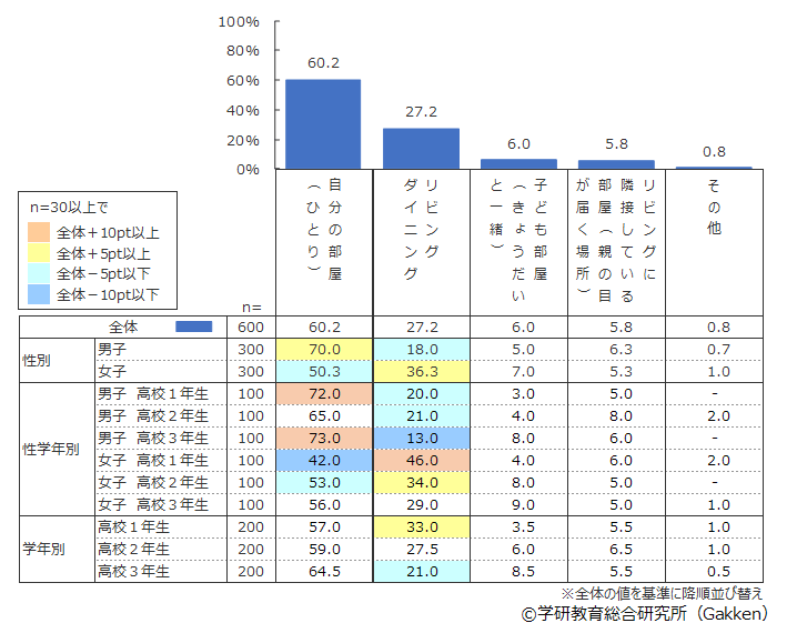 全体では「自分の部屋(ひとり)」が男女ともに1位で60.2%であることがわかった。男女別にみると、男子は70.0%で、女子の50.3%に対して20ポイントほど高いことがわかる。