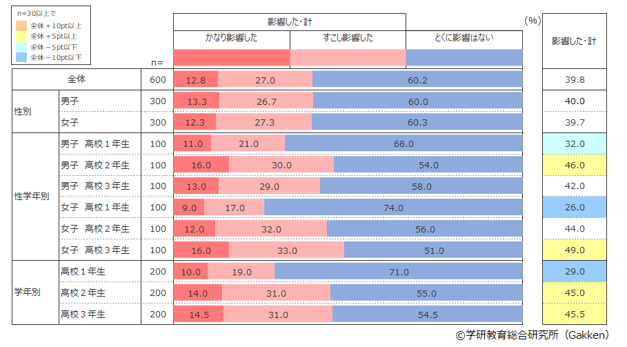全体でみると、「かなり影響した」「すこし影響した」が合計39.8%、およそ4割の高校生が新型コロナウイルス感染拡大の進路選択への影響を感じていることがわかった。男女別にみると、差は0.3ポイントでほとんどないが、学年別にみると、高校1年生に比べて2年生が16ポイント、3年生が16.5ポイント高い。とくに3年女子は49.0%と半数近くが影響を感じており、全体の平均より9.2ポイント、3年生男子と比べても7ポイント上回り、最も割合の低い1年生女子より23ポイントも高い数値となった。その影響が、進路について諦めたり我慢したりといったネガティブなものでないかが気になるところだ。これに関連する質問として、「新型コロナ流行の進路への影響(何に影響したか)」も併せて参考にしていただきたい。