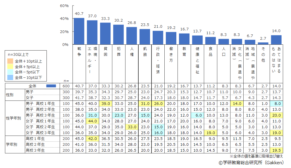「環境・エネルギー」(37.0%)が2位となったが、これは2020年度に中学生に行った調査で1位となった項目である。小売店でのプラスチック製レジ袋の有料化にともなうマイバッグ利用の促進や人気カフェチェーンでのプラスチックストロー廃止など、高校生にとって身近な話題が多いことが要因と考えられる。また、同世代のスウェーデンの環境活動家グレタ・トゥーンベリさんのメディア露出による影響も考えられる。
