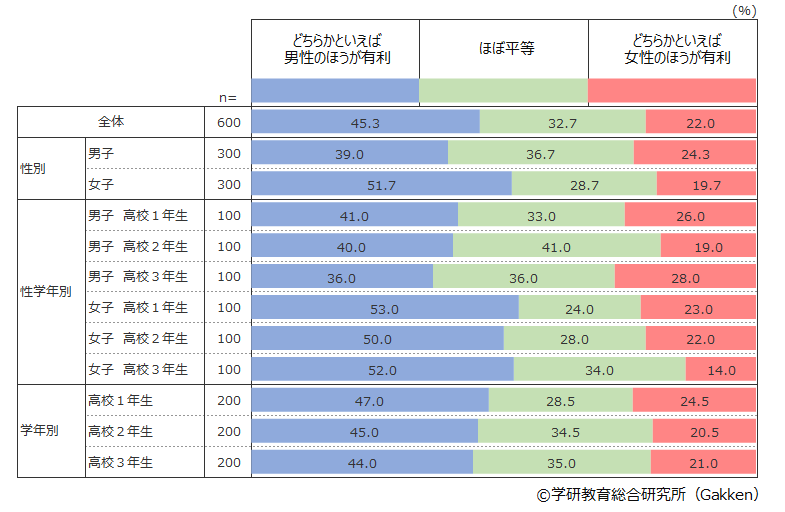 全体の数値をみると、「どちらかといえば男性のほうが有利」と感じている高校生は45.3%となり、「ほぼ平等」と感じる割合(32.7%)と12.6ポイントの差が開く結果となった。さらに男女別の数値を確認すると、女子の半数以上(51.7%)は「男性のほうが有利」と感じており、男子よりも12.7ポイント高い数値となっている。しかし男子においても同様に感じている割合(39.0%)は他の選択肢よりも高く、男女共通の認識といえそうだ。