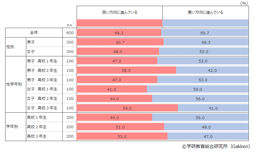 全体の結果は、ほぼ半々に割れた。学年別でみると、学年が上がるにつれて「良い方向に進んでいる」回答が増える。一方で、新型コロナウイルスの感染拡大や自然災害、経済の停滞など、目まぐるしく変わる世の中で、ますます将来の見通しが立たないことが結果として半々に割れたとも言えよう。