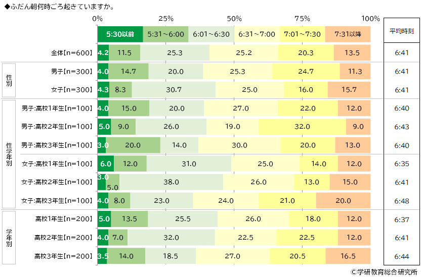 ふだん朝何時ごろ起きているかをきいたところ、「6:01~6:30」(25.3%)や「6:31~7:00」(25.2%)、「7:01~7:30」(20.3%)に回答が集まり、平均時刻は6:41でした。 過去の調査と比較すると、平均時刻は、6:34(2018年)→6:44(2021年)→6:41(2024年)と、6:30台から6:40台で推移する結果となりました。