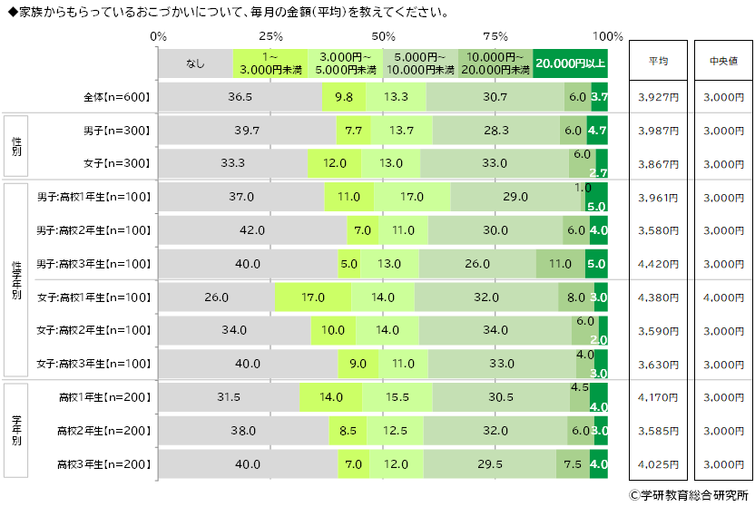 家族からもらっているおこづかいについて、毎月の金額(平均)をきいたところ、おこづかいをもらっている人の割合は63.5%(「なし」が36.5%)となり、平均は3,927円でした。