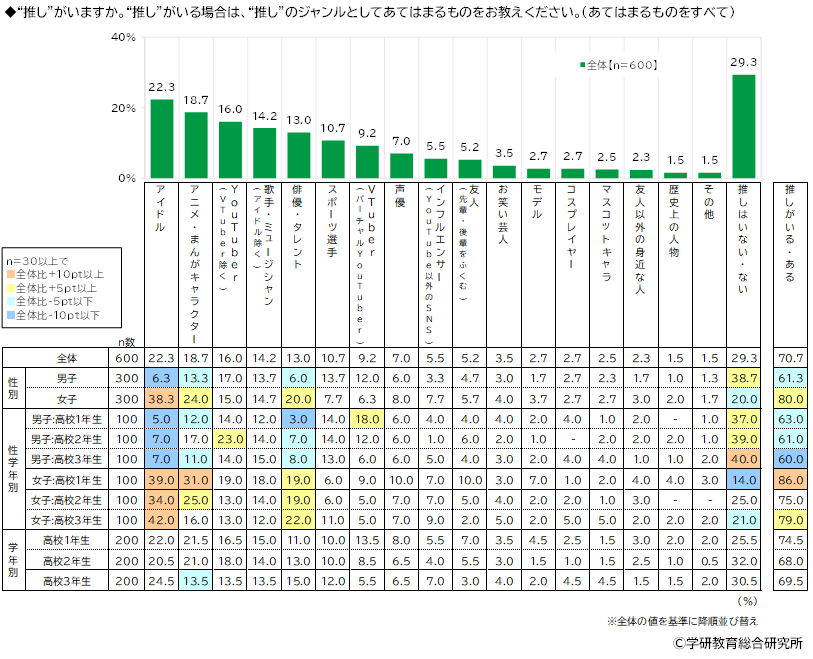 “推し”がいるかどうか、いる場合は“推し”のジャンルとしてあてはまるものをきいたところ、「推しはいない」は29.3%、推しがいる人の割合は70.7%となりました。“推し”のジャンルをみると、1位は「アイドル」(22.3%)、2位は「アニメ・まんがキャラクター」(18.7%)、3位は「YouTuber(VTuber除く)」(16.0%)、4位は「歌手・ミュージシャン(アイドル除く)」(14.2%)、5位は「俳優・タレント」(13.0%)でした。