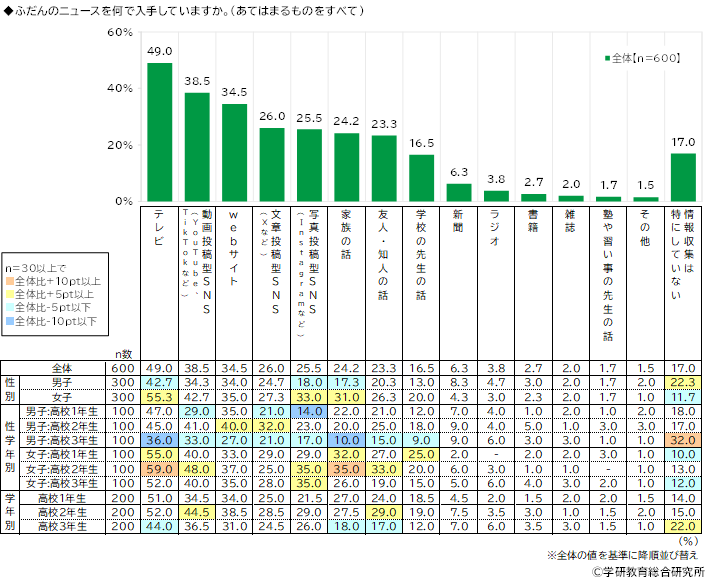 ふだんのニュースを何で入手しているかをきいたところ、「テレビ」(49.0%)が最も高くなり、「動画投稿型SNS(YouTube、TikTokなど)」(38.5%)、「webサイト」(34.5%)、「文章投稿型SNS(Xなど)」(26.0%)、「写真投稿型SNS(Instagramなど)」(25.5%)が続きました。
