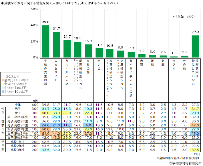 受験など教育に関する情報を何で入手しているかをきいたところ、「学校の先生の話」(39.8%)が最も高くなりました。通っている学校の先生から受験などに役立つ情報を得ている人が多いようです。次いで高くなったのは、「webサイト」(31.7%)、「友人・知人の話」(21.7%)、「動画投稿型SNS(YouTube、TikTokなど)」(19.5%)、「家族の話」(16.3%)でした。