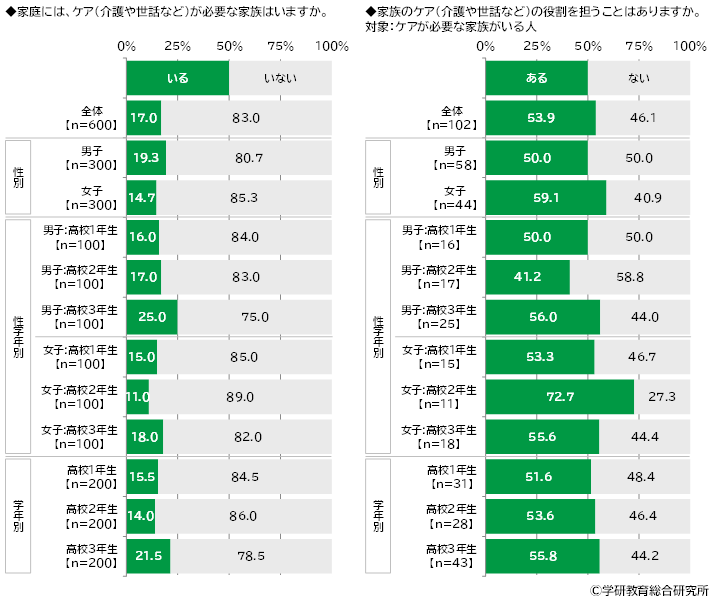 家庭にケア(介護や世話など)が必要な家族はいるかをきいたところ、「いる」は17.0%、「いない」は83.0%となりました。 ケアが必要な家族がいる人(102名)に、家族のケア(介護や世話など)の役割を担うことはあるかをきいたところ、「ある」は53.9%、「ない」は46.1%となりました。