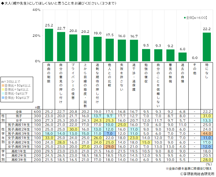 大人(親や先生)にしてほしくないことを聞いたところ、「自由の制限」(25.2%)が最も高くなりました。次いで高くなったのは、「自分の意見の押し付け」(22.7%)、「プライバシーの侵害」(20.8%)、「上から目線の態度・説教」(20.2%)、「過剰な期待の押し付け」(19.0%)でした。