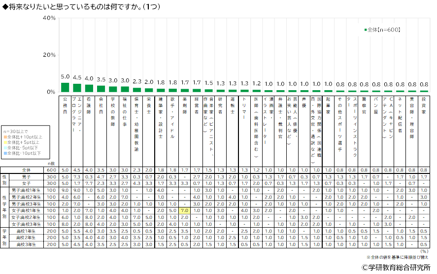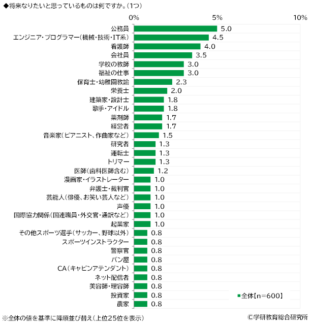 将来なりたいと思っているものをきいたところ、1位「公務員」(5.0%)、2位「エンジニア・プログラマー(機械・技術・IT系)」(4.5%)、3位「看護師」(4.0%)、4位「会社員」(3.5%)、5位「学校の教師」「福祉の仕事」(いずれも3.0%)となりました。