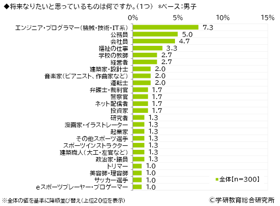 男子についてみると、1位「エンジニア・プログラマー」(7.3%)、2位「公務員」(5.0%)、3位「会社員」(4.7%)となりました。 学年別にみると、1年生では「公務員」と「エンジニア・プログラマー」が同率で1位、2年生では「福祉の仕事」、3年生では「エンジニア・プログラマー」が1位でした。