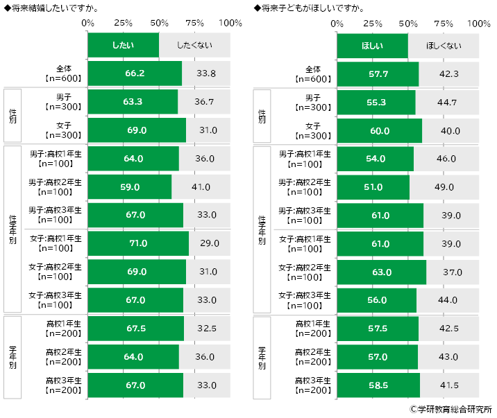 「子どもがほしい」と回答した理由をみると、「子どもが好きだから」(1年生男子)や「少子高齢化に歯止めをかけるため」(2年生男子)、「子どもがいると癒やされそうだから」(3年生男子)、「子どもがいたら楽しそうだから」(1年生女子)、「老後が心配だから」(1年生女子)、「自分の遺伝子を残したいから」(2年生女子)といった回答がありました。