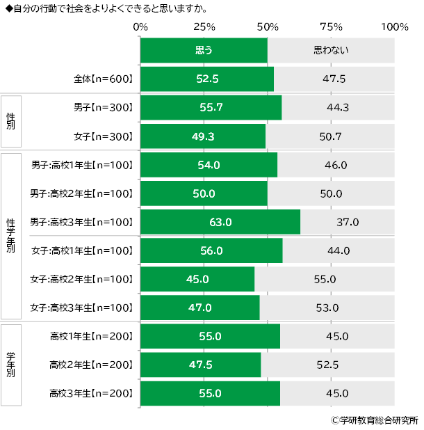 自分の行動で社会をよりよくできると思うかをきいたところ、「思う」は52.5%、「思わない」は47.5%となりました。 男女・学年別にみると、自分の行動で社会をよりよくできると考えている人の割合が最も高くなったのは、男子では3年生(63.0%)、女子では1年生(56.0%)でした。