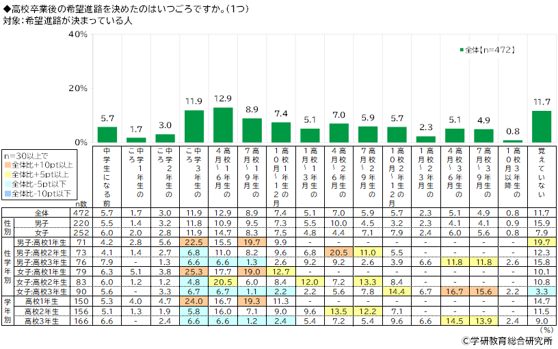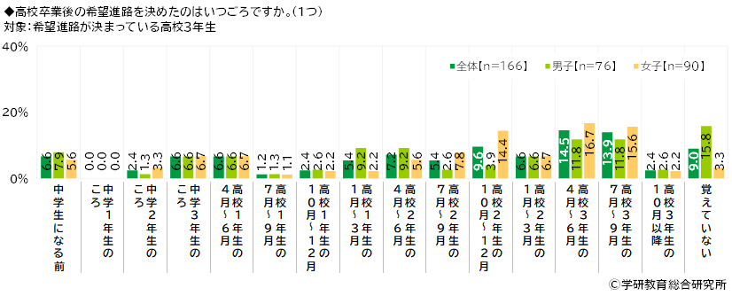 男女別にみると、男子・女子ともに「高校3年生の4月~6月」(男子11.8%、女子16.7%)と「高校3年生の7月~9月」(男子11.8%、女子15.6%)が高くなり、男子では「高校1年生の1月~3月」と「高校2年生の4月~6月」(いずれも9.2%)、女子では「高校2年生の10月~12月」(14.4%)がそれぞれ続きました。