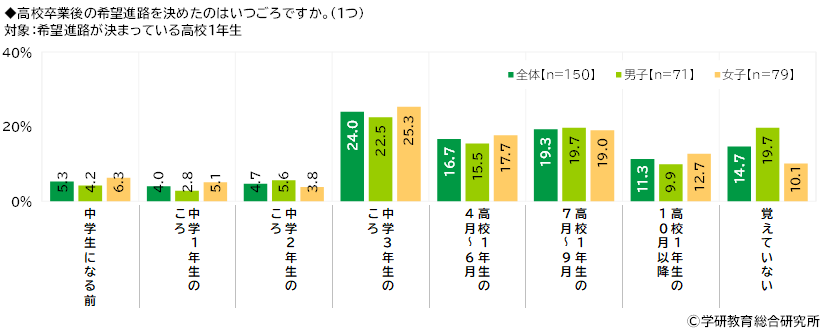 1年生(150名)についてみると、「中学3年生のころ」(24.0%)が最も高くなり、「高校1年生の7月~9月」(19.3%)、「高校1年生の4月~6月」(16.7%)が続きました。