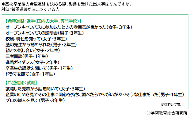 また、影響を受けた出来事をみると、希望進路が【進学(国内の大学、専門学校)】の人では「オープンキャンパスに参加したときの雰囲気が良かった」や「オープンキャンパスの説明会」などオープンキャンパスへの参加がきっかけとなったケースが多くみられました。そのほか、「校風、特色を知って」や「塾の先生から勧められた」、「親との話し合い」、「進路ガイダンス」、「ドラマを観て」といった回答がありました。