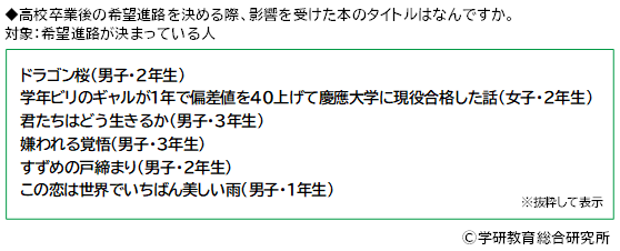 まず、影響を受けた本のタイトルをみると、『ドラゴン桜』や『学年ビリのギャルが1年で偏差値を40上げて慶應大学に現役合格した話』といった受験がテーマになっている本のほか、『君たちはどう生きるか』や『嫌われる覚悟』、『すずめの戸締まり』、『この恋は世界でいちばん美しい雨』といった回答がありました。