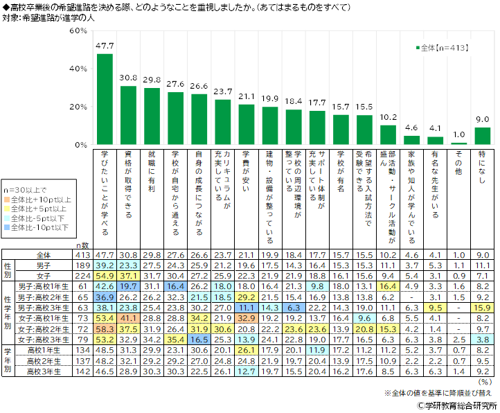 希望進路が進学の人(413名)に、高校卒業後の希望進路を決める際、どのようなことを重視したかをきいたところ、1位は「学びたいことが学べる」(47.7%)でした。次いで、2位「資格が取得できる」(30.8%)、3位「就職に有利」(29.8%)、4位「学校が自宅から通える」(27.6%)、5位「自身の成長につながる」(26.6%)となりました。