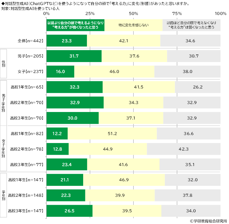 対話型生成AIを使っている人(442名)に、対話型生成AIを使うようになって自分の頭で「考える力」に変化(影響)があったと思うかをきいたところ、「以前より自分の頭で考えるようになり“考える力”が強くなったと思う」は23.3%、「特に変化を感じない」は42.1%、「以前ほど自分の頭で考えなくなり“考える力”は弱くなったと思う」は34.6%となりました。