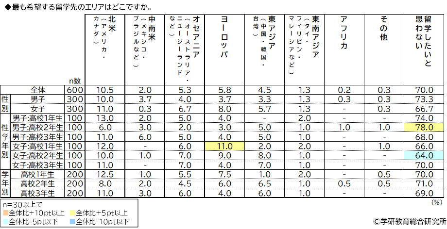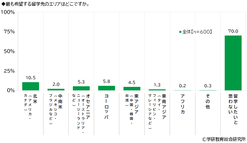 最も希望する留学先のエリアをきいたところ、1位「北米(アメリカ・カナダ)」(10.5%)、2位「ヨーロッパ」(5.8%)、3位「オセアニア(オーストラリア・ニュージーランドなど)」(5.3%)となった一方、「留学したいと思わない」が70.0%、留学したい人の割合が30.0%で、多数が留学を希望していない結果となりました。