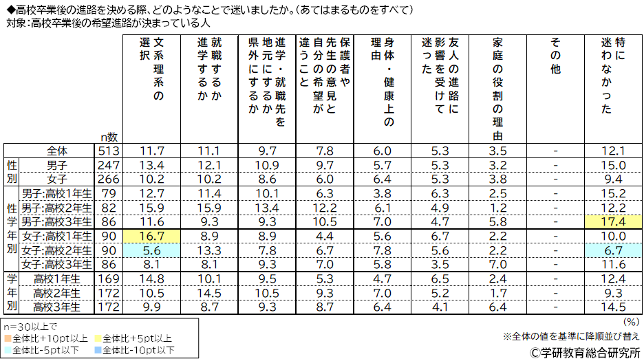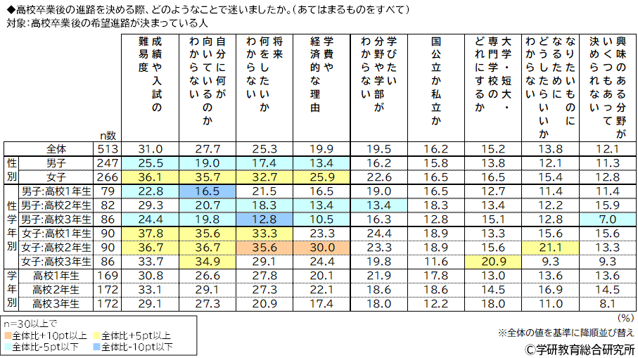 男女別にみると、「成績や入試の難易度」(男子25.5%、女子36.1%)、「自分に何が向いているのかわからない」(男子19.0%、女子35.7%)、「将来何をしたいかわからない」(男子17.4%、女子32.7%)、「学費や経済的な理由」(男子13.4%、女子25.9%)は男子と比較して女子が10ポイント以上高くなりました。