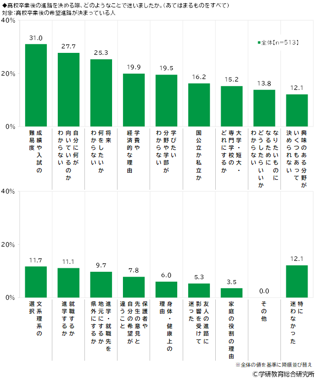 高校卒業後の希望進路が決まっている人(513名)に、高校卒業後の進路を決める際、どのようなことで迷ったかをきいたところ、1位「成績や入試の難易度」(31.0%)、2位「自分に何が向いているのかわからない」(27.7%)、3位「将来何をしたいかわからない」(25.3%)、4位「学費や経済的な理由」(19.9%)、5位「学びたい分野や学部がわからない」(19.5%)となりました。
