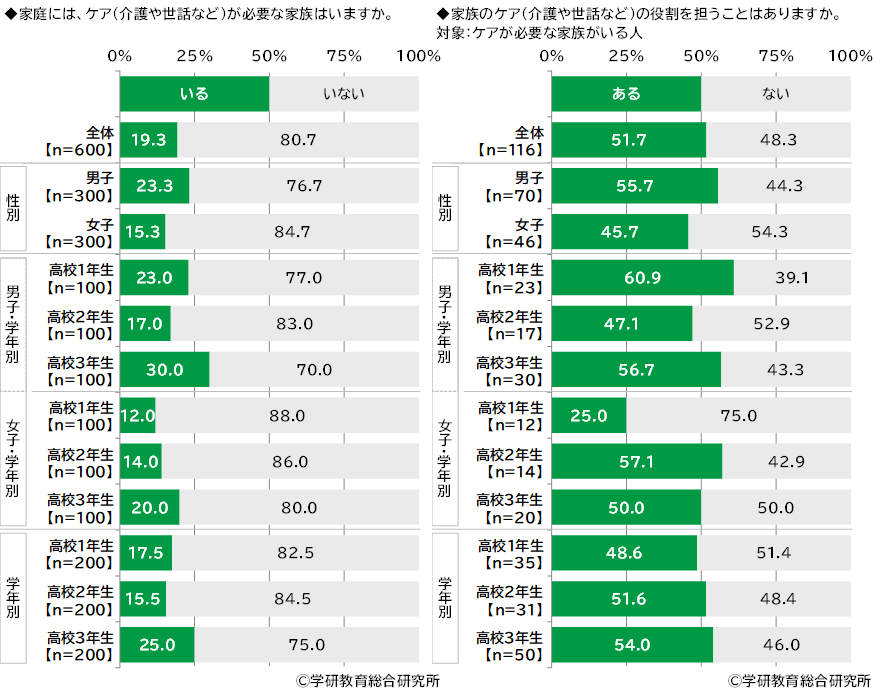 家庭にケア(介護や世話など)が必要な家族はいるかをきいたところ、「いる」は19.3%、「いない」は80.7%となりました。