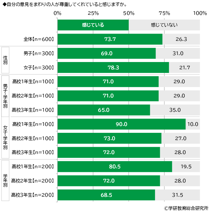 自分の意見をまわりの人が尊重してくれていると感じるかをきいたところ、「感じている」は73.7%、「感じていない」は26.3%となりました。