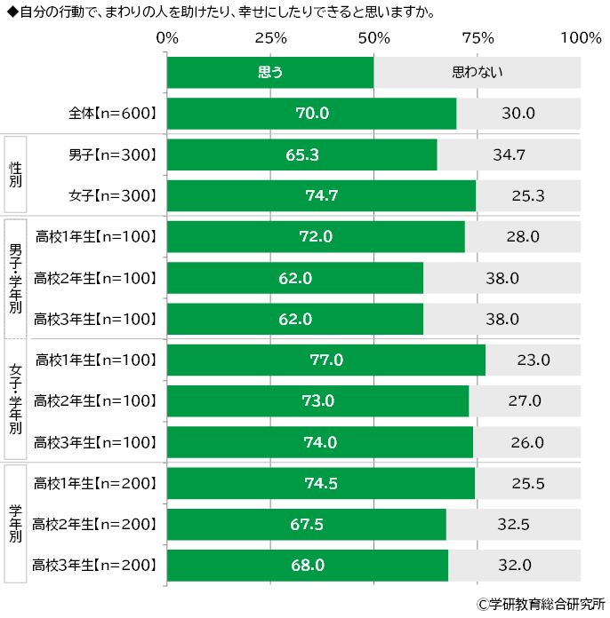 自分の行動で、まわりの人を助けたり、幸せにしたりできると思うかをきいたところ、「思う」は70.0%、「思わない」は30.0%となりました。 男女・学年別にみると、男子では「思う」と回答した人の割合が最も高くなったのは1年生(72.0%)で、2年生と3年生(いずれも62.0%)より10.0ポイント高くなりました。