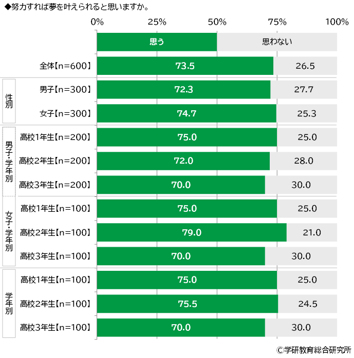 努力すれば夢を叶えられると思うかをきいたところ、「思う」は73.5%、「思わない」は26.5%となりました。