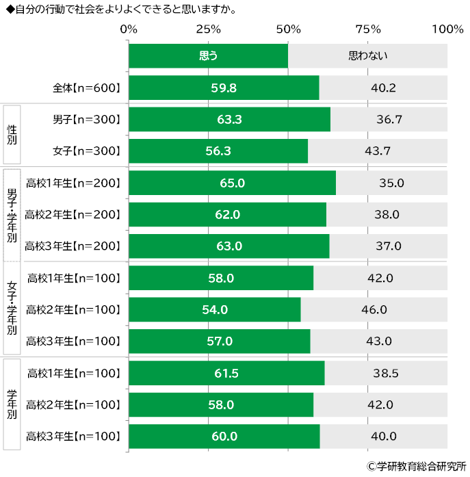 自分の行動で社会をよりよくできると思うかをきいたところ、「思う」は59.8%、「思わない」は40.2%となりました。