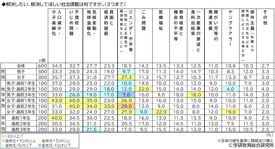男女別にみると、「ジェンダー不平等」は、男子(9.7%)と比較して女子(27.3%)が17.6ポイント高くなりました。