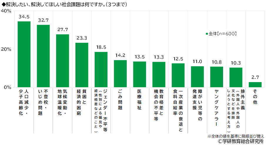 解決したい、解決してほしい社会課題をきいたところ、「人口減少・少子高齢化」(34.5%)が最も高くなり、「不登校・いじめ問題」(32.7%)、「気候変動・地球温暖化」(27.7%)、「貧困と経済的困窮」(23.3%)、「ジェンダー不平等」(18.5%)が続きました。