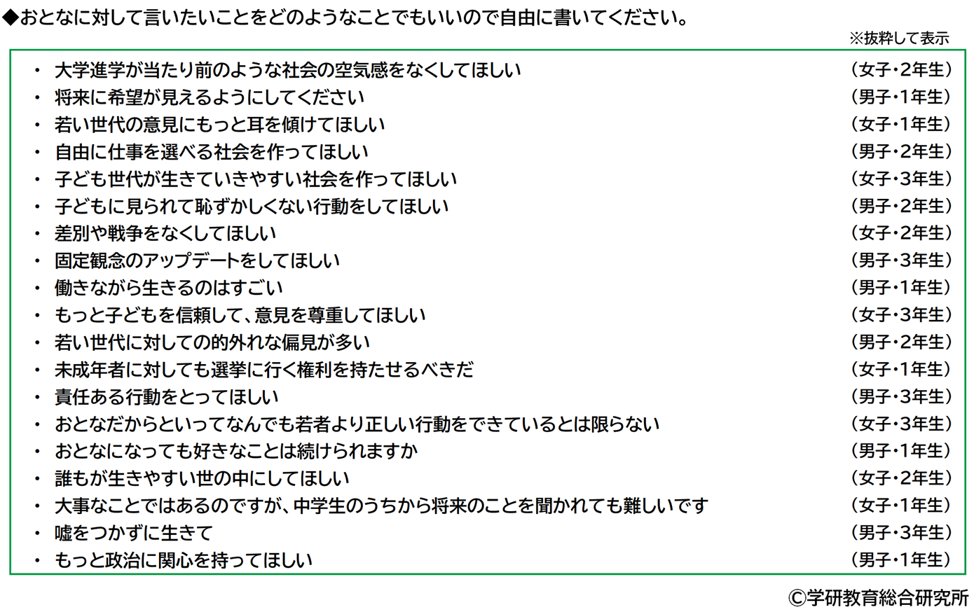 おとなに対して言いたいことを自由回答できいたところ、「固定観念のアップデートをしてほしい」(3年生男子)や「若い世代に対しての的外れな偏見が多い」(2年生男子)、「もっと子どもを信頼して、意見を尊重してほしい」(3年生女子)、「若い世代の意見にもっと耳を傾けてほしい」(1年生女子)といった、若い世代の考えや価値観を受け入れてほしいというような意見がみられました。