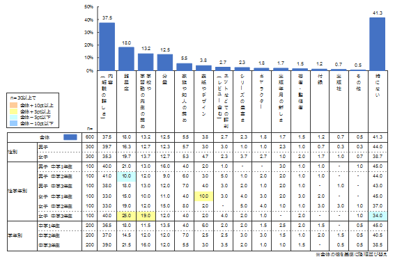 中学生が学習参考書・問題集を購入するときに重視しているものを聞いたところ、「特にない」を除けば、「内容(解説の詳しさ)」(37.5%)が圧倒的に多く、「難易度」(18.0%)、「学校や学習塾の先生の薦め」(13.2%)と続く。男女・学年別に見ると、とくに3年生女子が「難易度」や「学校や学習塾の先生の薦め」を重視している。