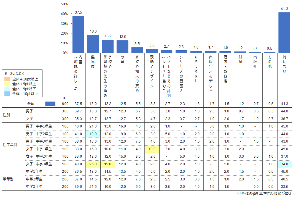 小学生に同様の質問をした際 も、「内容(解説の詳しさ)」、「難易度」を重視する傾向は変わらないが、小学生では比較的上位にあった「表紙やデザイン」、「キャラクター」は、中学生ではそれぞれ7.6ポイント、3.9ポイント下がっている。逆に、「学校や学習塾の先生の薦め」、「家族や知人の薦め」は小学生よりも中学生の方が数値は高く、中学生は学習参考書・問題集に「見た目」よりも「中身」を重視する傾向が強まるといえる。