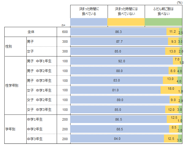 朝食は体内時計をリセットし、活力のある一日をスタートさせるうえで重要な役割をもつ。とくに発育において朝食は欠かせない習慣であるが、中学生は毎日の習慣として朝食をとっているのだろうか。