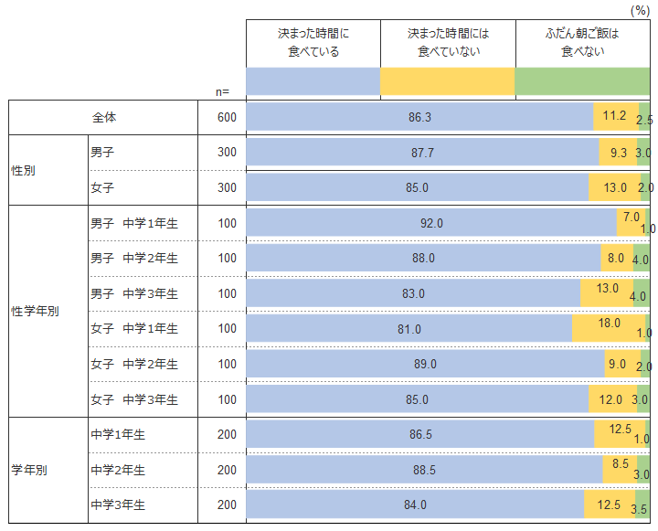 結果をみると、全体の97.5%が朝食をとっていることがわかった。これは小学生白書2017の調査結果 である98.3%とほぼ同じ割合であり、学年間での大きな差はみられない。しかし、「決まった時間に食べている」と回答した中学生、つまり規則正しく朝食をとっている割合は全体の86.3%であり、朝食をとる習慣がないか、あるいは規則正しくとっていない割合が13.7%となった。この割合は、男子は学年が上がるほど高くなっており、また1年生女子(19.0%)がとりわけ高い値である。