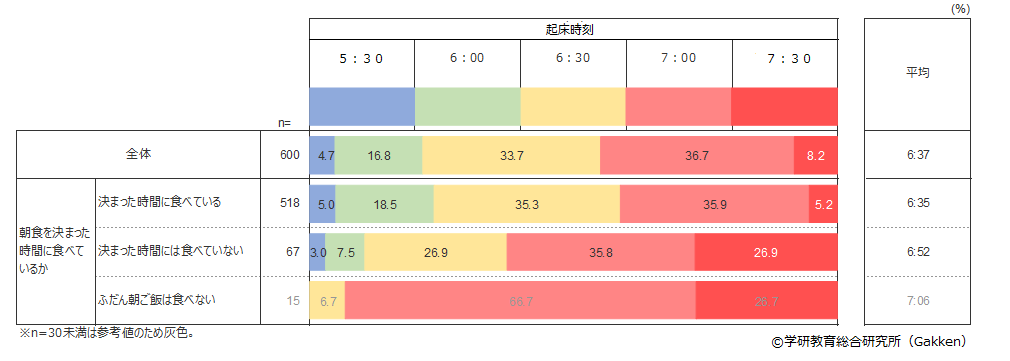 とくに目を引くのは、起床時刻が遅くなるほど、朝ごはんを食べない傾向が強まることである。平均起床時刻を見ても、朝食を「決まった時間に食べている」と回答した中学生の6:35に対して、「ふだん朝ご飯は食べない」と回答した中学生は30分以上遅い7:06であった。