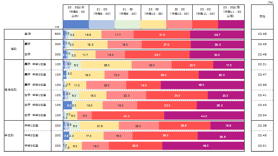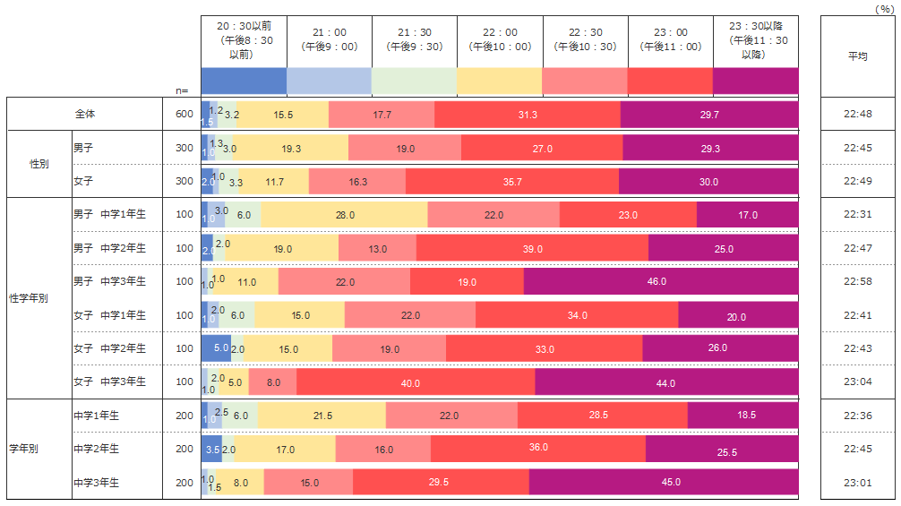 今回の調査では中学生全体の平均就寝時間は22:48となり、23:00以降に就寝している割合が61.0%という結果になった。全体的な傾向としては、起床時刻同様、学年が上がるほど就寝時刻が遅くなっていることがわかった。とくに、学年が上がるにつれて「23:30以降」の回答率が顕著に増加しているのが見て取れる。また、小学生全体の平均就寝時刻 である21:40と比較すると、1時間08分後ろ倒しになっていることがわかる。
