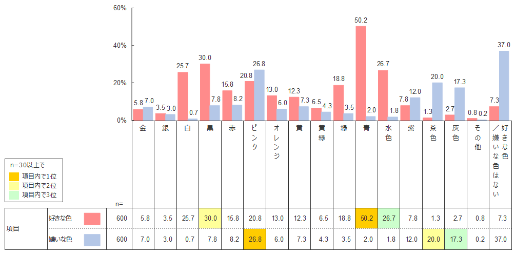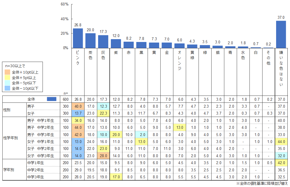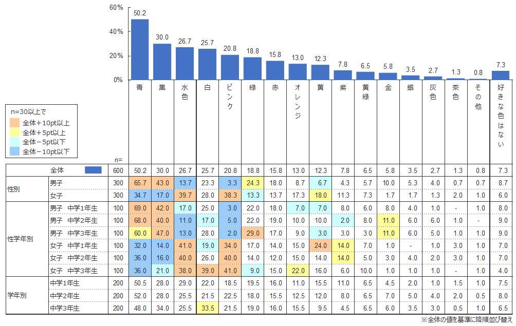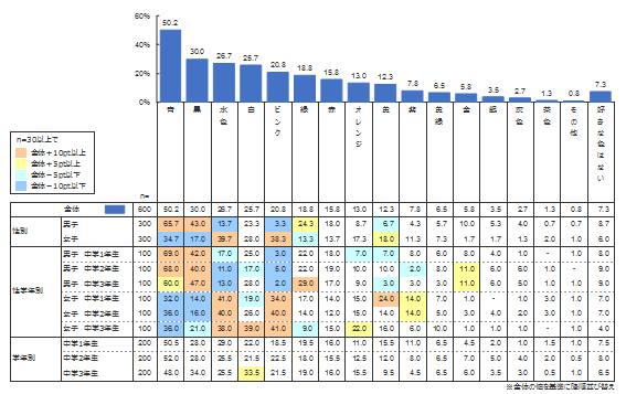 幼児白書2017 、小学生白書2017 でも調査している色の好みだが、中学生ではどのように変化するのだろうか。 中学生全体でみたときの好きな色は、1位「青」(50.2%)、2位「黒」(30.0%)、3位「水色」(26.7%)となった。ダントツの「青」は小学生と同様の結果となったが、小学生の好きな色では5位(17.0%)であった「黒」の割合が30.0%と、13ポイント上昇している。 嫌いな色は1位「ピンク」(26.8%)、2位「茶色」(20.0%)、3位「灰色」(17.3%)となった。小学生男子の不人気が目立った「ピンク」だが、中学生になるとさらにその傾向が強まっていることがわかる。小学生と比較して「ピンク」の女子人気も落ちているものの、「ピンク」の好き・嫌いに対する男女の逆転現象は依然として際立っている。一方、「嫌いな色はない」割合が「好きな色はない」より多い点は小学生と変わらず、男女差はみられない。