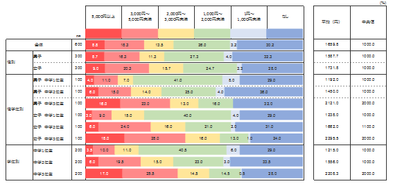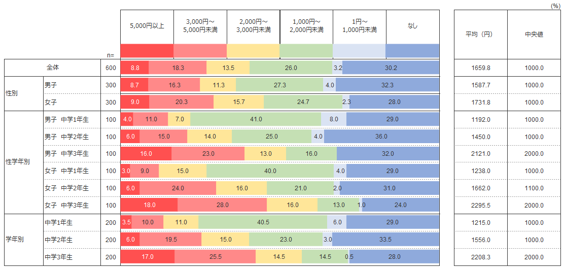 本調査結果での各学年の平均金額は、学年が上がるにつれて増えている。1年生が1,215円、2年生が1,556円、3年生が2,208円だった。また、中学生全体の平均金額は1,660円だった。ただし、各学年ともおこづかいは「なし」との回答が3割前後を占めており、学年が上がるにつれておこづかいの平均金額は上がりつつも、「なし」の割合には大きな変化がみられない。その理由として、おこづかいとして定期的にお金をもらうのではなく、必要なときだけ保護者がお金を出すという考え方の家庭が一定の割合で存在している可能性がある。なお、同時に行った小学生白書2017の調査 では、6年生のおこづかいの平均金額は717円だった。中学1年生とは498円の差があり、これは小学生の各学年間の差よりも大きい。中学校への進学にあわせて、小学校在学中の進級時よりも大きな幅でおこづかいを増やす家庭が多いことがうかがえる。