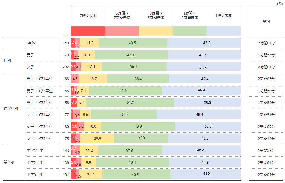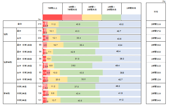 学年が上がるにつれて男子の平均読書時間が短くなるのに対し、女子は長くなる傾向があることがわかった。ただし、週の読書時間が「1時間未満」の割合は、男子・女子ともに、学年による大きな増減はない。一方で、週の読書時間が「3時間以上」の割合は男女の違いが目立ち、男子は1年生で21.2%、2年生で10.7%、3年生で9.0%と3年間で半減するのに対し、女子は1年生で11.7%、2年生で17.6%、3年生で25.4%と倍増している点は興味深い。