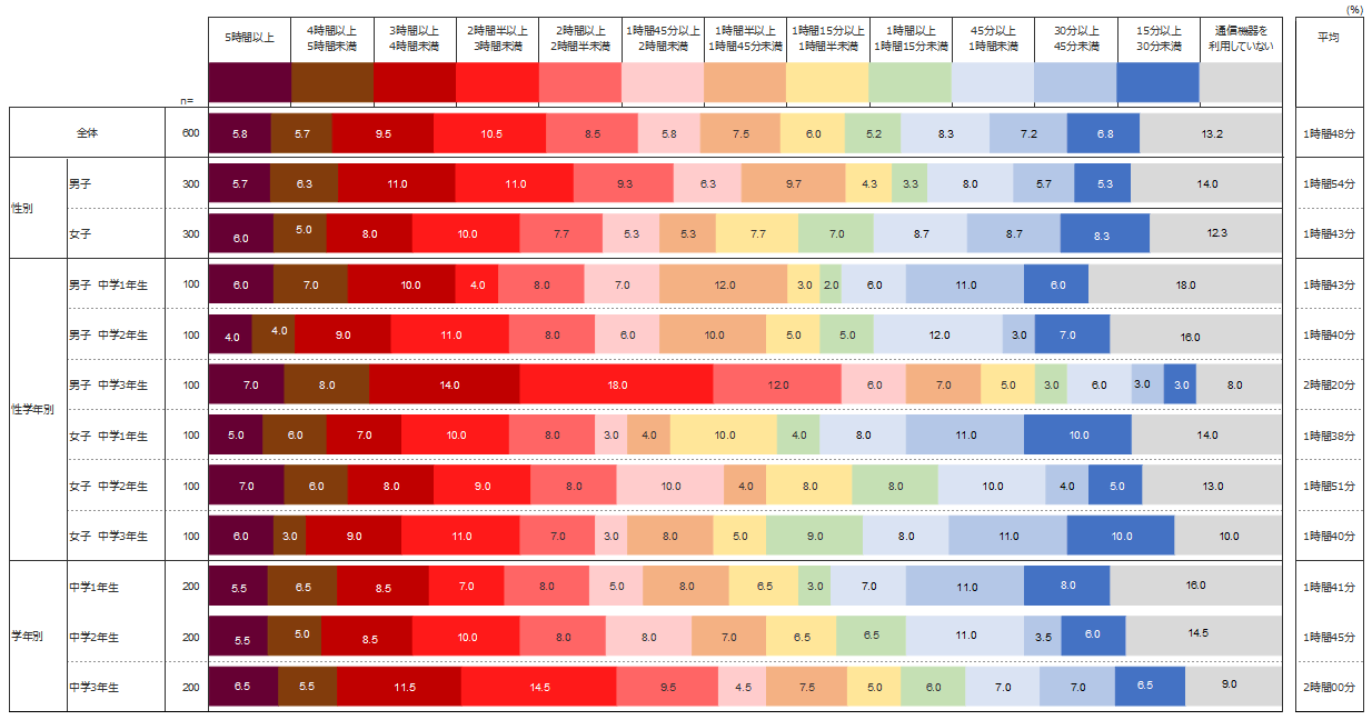 中学生全体の通信機器利用時間の平均は1時間48分であった。また、モバイル社会研究所が行った調査※1によると、スマホ・ケータイに絞った場合、中学生の4~6割が毎日1時間以上インターネットを利用しているということも明らかになっている。