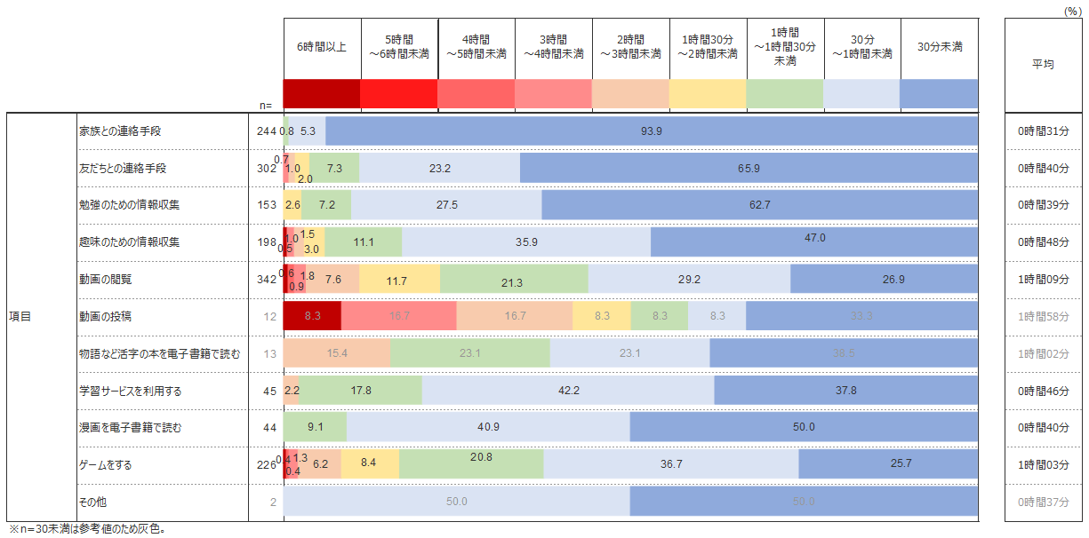 最も長い時間を使っているのは「動画の投稿」(1時間58分)で、次いで「動画の閲覧」(1時間09分)、「ゲームをする」(1時間03分)、「趣味のための情報収集」(0時間49分)となった。「動画の投稿」は該当人数が少ないものの、かけている時間の長さでは上位に食い込むことがわかる。動画とゲームの利用時間のボリュームゾーンは「30分~1時間未満」だが、趣味の情報収集は「30分」であった。通信機器の利用目的として動画とゲームを選んでいる男子の割合の高さをみると、コミュニケーション手段として通信機器を利用している女子よりも、利用時間は長い傾向にあると言えそうだ。