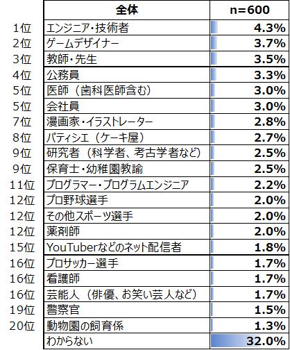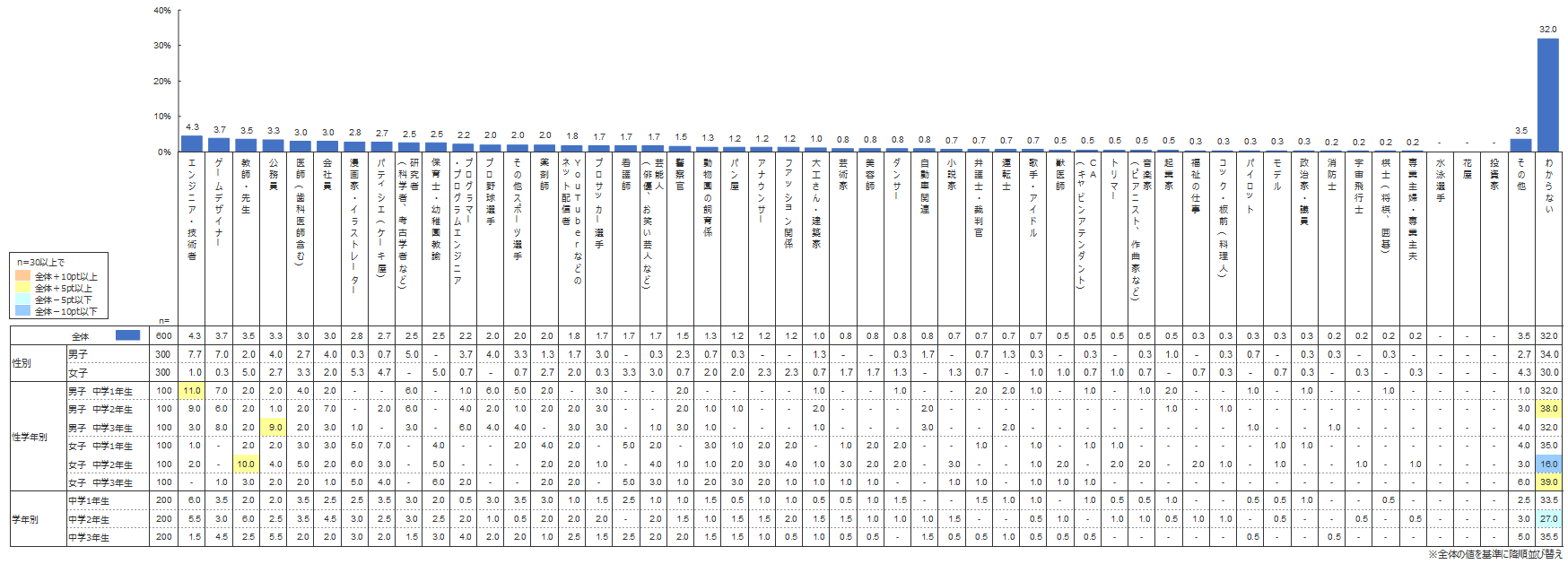 全体1位は、小学生では30位で0.8%だった「エンジニア・技術者」(4.3%)、2位は、小学生では20位の1.3%だった「ゲームデザイナー」(3.7%)となった。一方で、小学生では7.6%と最も人気のあった「パティシエ」は順位が下がり、8位(2.7%)となった。小学生では2位の4.3%だった「プロサッカー選手」も大きく順位を下げ、16位となった。その理由の一つとして、小学生から中学生へと成長するにつれ、職業についての認識が純粋な憧れから現実的なものへと変わっていくことが考えられる。