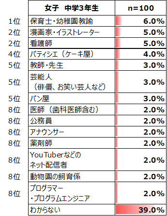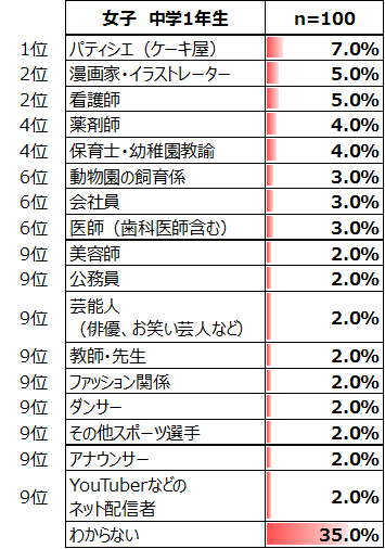 学年・男女別にみると、女子は男子と違い、小学生と比較して上位が大きく入れ替わっているものは少ない。小学生・女子では14.3%と1位であった「パティシエ(ケーキ屋)」は、中学生では4位(4.7%)に、小学生・女子では5.0%と2位であった「看護師」は5位(3.3%)に下がっている。