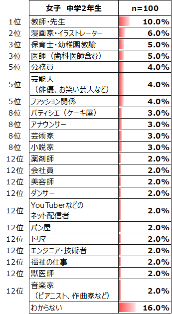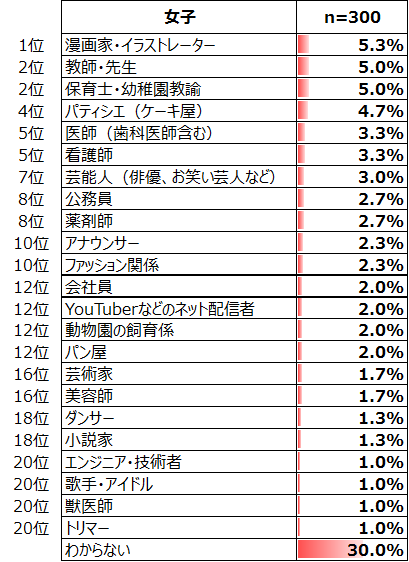 一方、小学生・女子では4.0%と3位であった「教師・先生」は2位(5.0%)に上がり、小学生・女子では3.3%と7位であった「漫画家・イラストレーター」が1位(5.3%)に、小学生・女子では3.0%と8位であった「保育士・幼稚園教諭」が3位(5.0%)に上がっている。