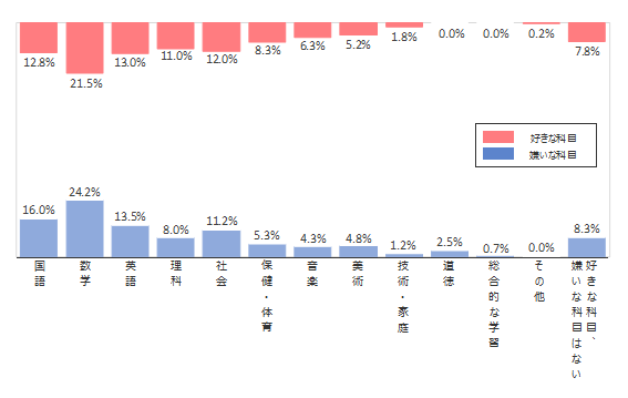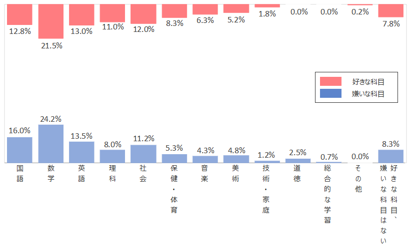 中学生が好きな教科として選んだ割合の上位5つは「数学」(21.5%)、「英語」(13.0%)、「国語」(12.8%)、「社会」(12.0%)、「理科」(11.0%)となった。一方、嫌いな教科の上位5つは「数学」(24.2%)、「国語」(16.0%)、「英語」(13.5%)、「社会」(11.2%)、「理科」(8.0%)となり、好き・嫌いのいずれも主要5教科が上位を占める結果となった。なお、好きな教科あるいは嫌いな教科のどちらかに選んだ割合※1 を見ると、1位の「数学」(好き・嫌いの合計、45.7%)が、2位の「国語」(28.8%)と3位の「英語」(26.5%)を大きく引き離す結果となった。好きにせよ、嫌いにせよ、中学生にとって関心が高い教科としては、数学がダントツである。また、この特徴は小学校 の算数にも同様にみられる。