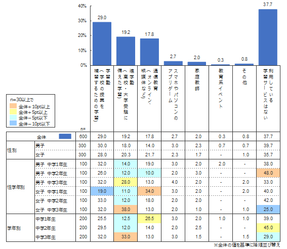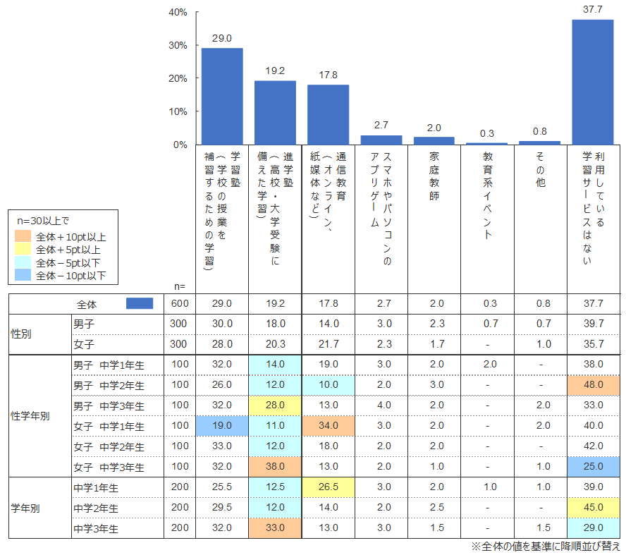 中学生は学校以外での学習の機会をどのように得ているのだろうか。 男子・女子ともに3年生になると「進学塾」に通う割合が一気に増えていることが大きな特徴である。また、1年生の「学習塾」と「通信教育」については男女の割合が逆転しており、男子は「学習塾」を利用する割合が高く、女子は「通信教育」を利用する割合が高いことは興味深い。しかし、「通信教育」に関しては学年が上がるにつれて利用者が減少することがわかった。スマホやパソコンを利用した学習アプリやゲームを用いて学習している中学生はまだ少ないが、通信機器の普及に伴い、このような学習サービス分野は今後成長が見込まれそうだ。
