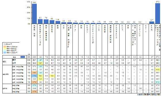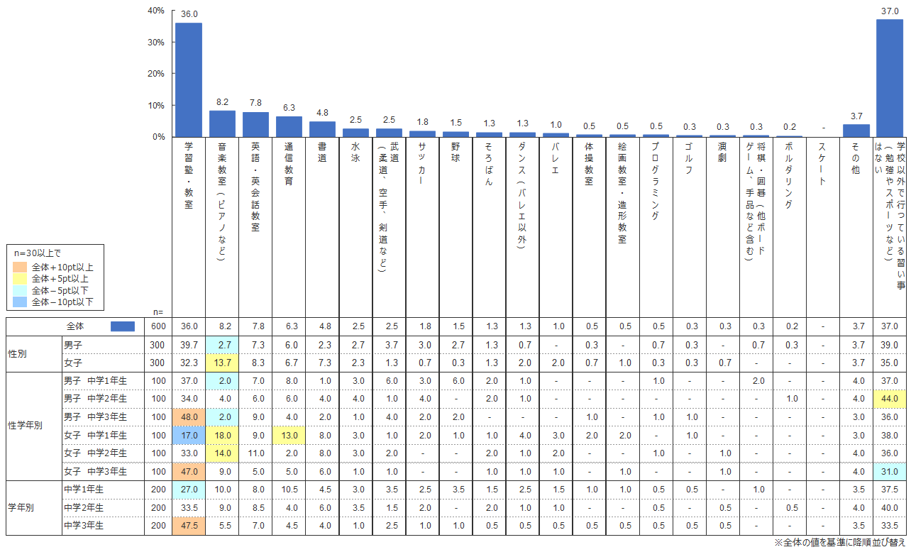 小学生と状況は変わり、第1位は圧倒的に「学習塾・教室」(36.0%)となった。3年生では半数近くの割合に達することから、高校入試などを意識していることがうかがえる。上位6項目は小学生の調査結果 と顔ぶれは変わらないが、中学生の「学習塾・教室」の回答率の高さは、小学生との顕著な違いである。さらに、小学生の習い事で1位であった「水泳」は、中学生では2.5%とかなり少なくなっており、多くが小学校高学年から中学にかけてやめてしまうことがわかる。